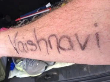 A volunteer wrote the name Vaishnavi on my arm. Vaishnavi is an 18 year old from India who believes she was taken from her parents at an early age and forced into prostitution at 13. She was rescued several times by a group called Freedom Firm, only to be dragged back to the red light district. Finally, in 2013 she was rescued for good and today lives in government shelter, where she receives counseling, and is learning to live a more normal life.